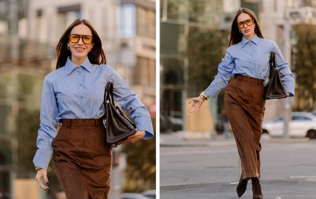 Замшева спідниця — один з головних трендів цієї осені. Колишня дружина телеведучого Володимира Остапчука, нотаріус і блогерка Христина Горняк показала, як стильно носити модну річ у повсякденному образі.