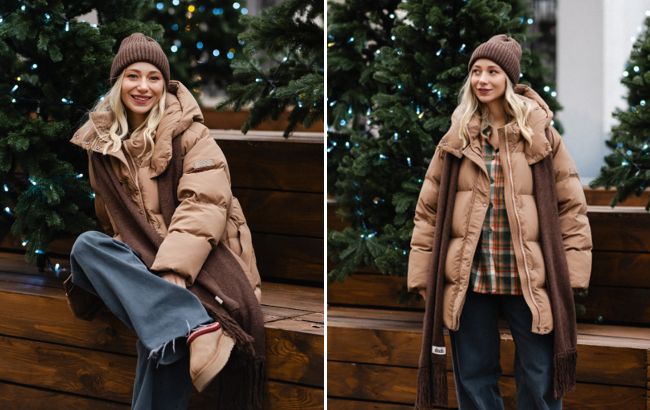 Головну роль у луці зіграв верхній одяг. Катерина обрала пуховик-оверсайз у трендовому відтінку кемел — теплому бежево-пісочному кольорі.