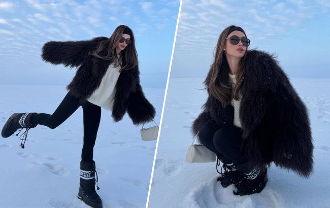 Для прогулянки засніженою місцевістю Таня Парфільєва обрала Moon Boot у чорно-білій гамі. Це взуття давно вийшло за межі гірськолижного спорядження та стало частиною високої моди.